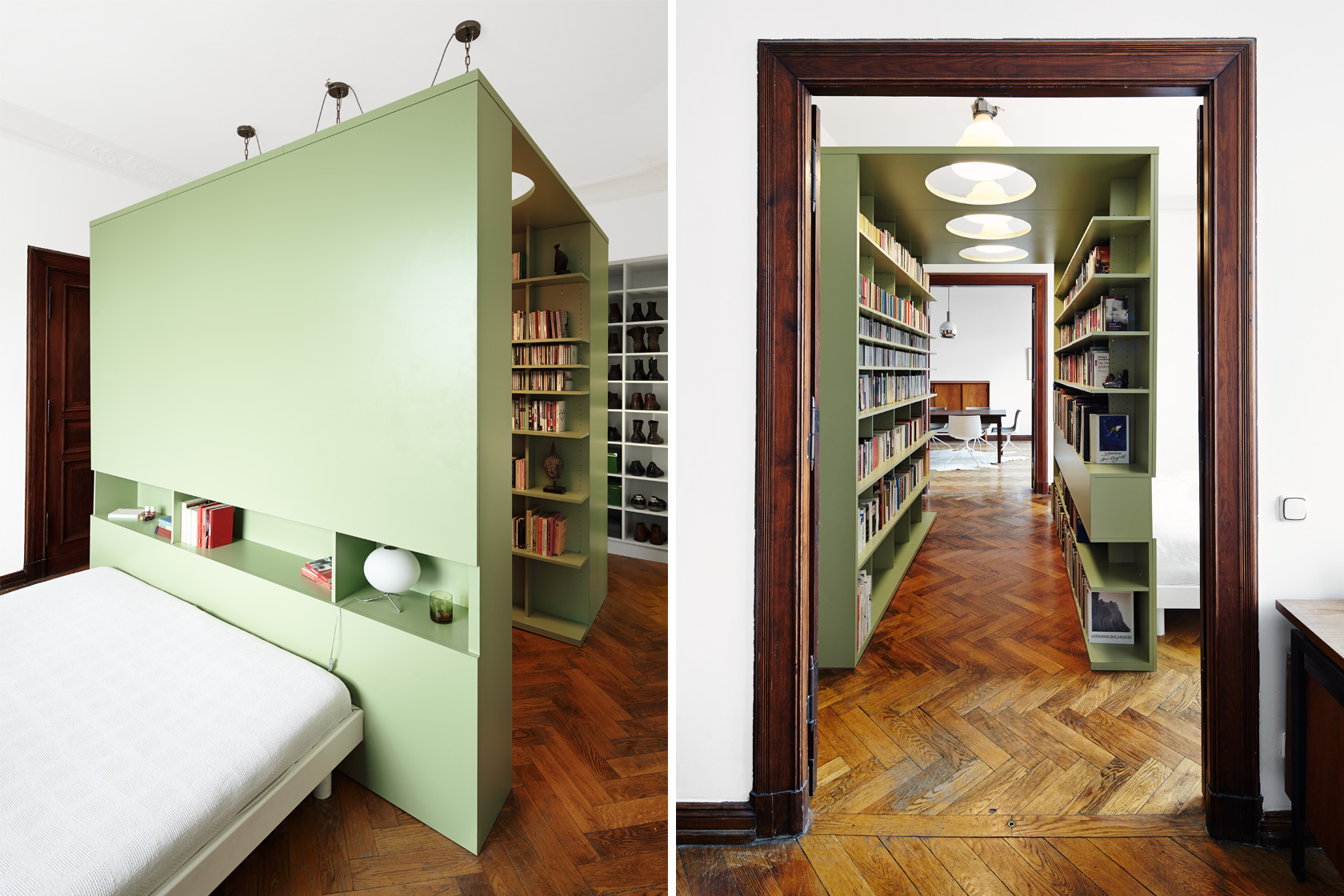 Als Durchgang im Durchgangszimmer hat Carsten Wiewiorra diesen Bibliothekswürfel konzipiert. Er steht im Schlafzimmer und verbindet Ess- und Arbeitszimmer, trennt zugleich das Schlafzimmer visuell von den restlichen Räumen und schafft so einen Raum im Raum.