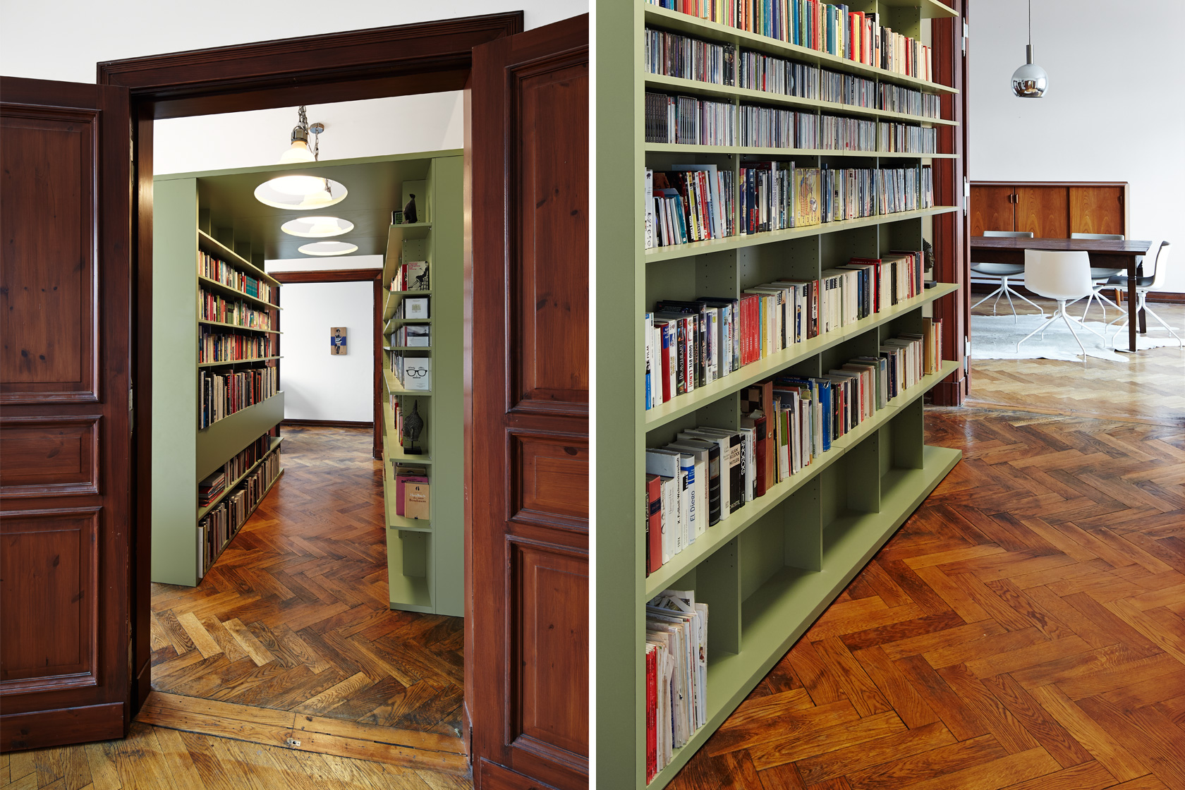Als Durchgang im Durchgangszimmer hat Carsten Wiewiorra diesen Bibliothekswürfel konzipiert. Er steht im Schlafzimmer und verbindet Ess- und Arbeitszimmer, trennt zugleich das Schlafzimmer visuell von den restlichen Räumen und schafft so einen Raum im Raum.